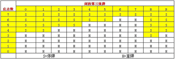 如闲家拿了第三张牌,对庄家的游戏规定变化形式则变得较多了。庄家拿到7点停牌,但是在6点或少于6点时拿牌或停牌取决于闲 家的第三张牌面值(而不是闲家手中的牌点)。指导庄家拿牌或停牌的游戏规则如下: