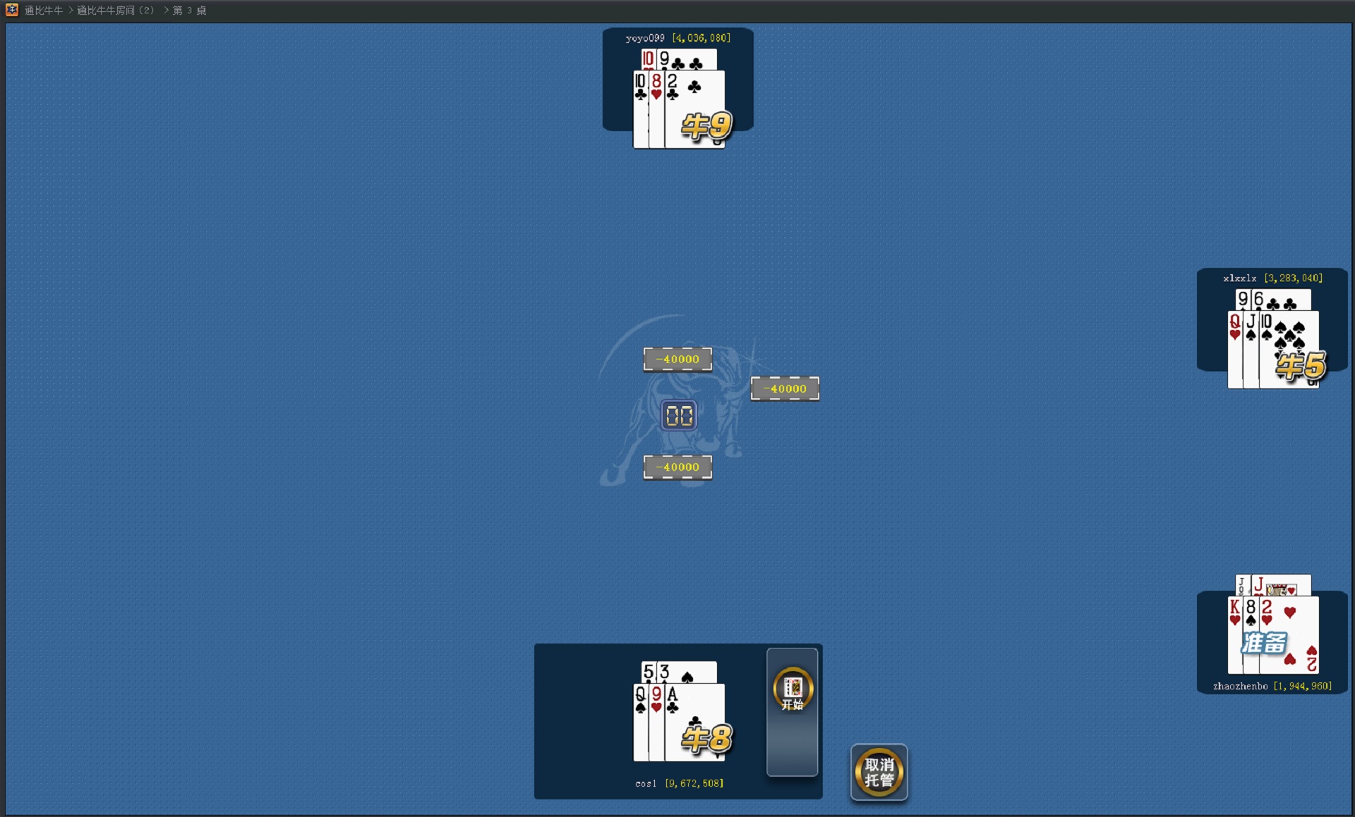 第一局游戏,游戏开始后系统开始发牌,每个玩家分得五张牌,玩家编排牌型后亮牌比较大小,所有玩家比较牌型的大小计算得分。
